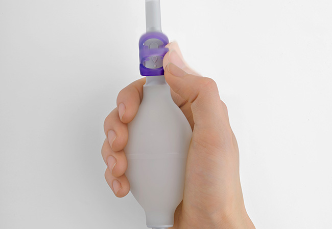 Flow Konus mit einer weichen, abgerundeten und flexiblen Konusspitze für ein sanftes und bequemes Einführen und Entfernen. Der Wasserschlauch wird direkt in den Konus gesteckt, damit der Flow Konus stabil in der Hand liegt.