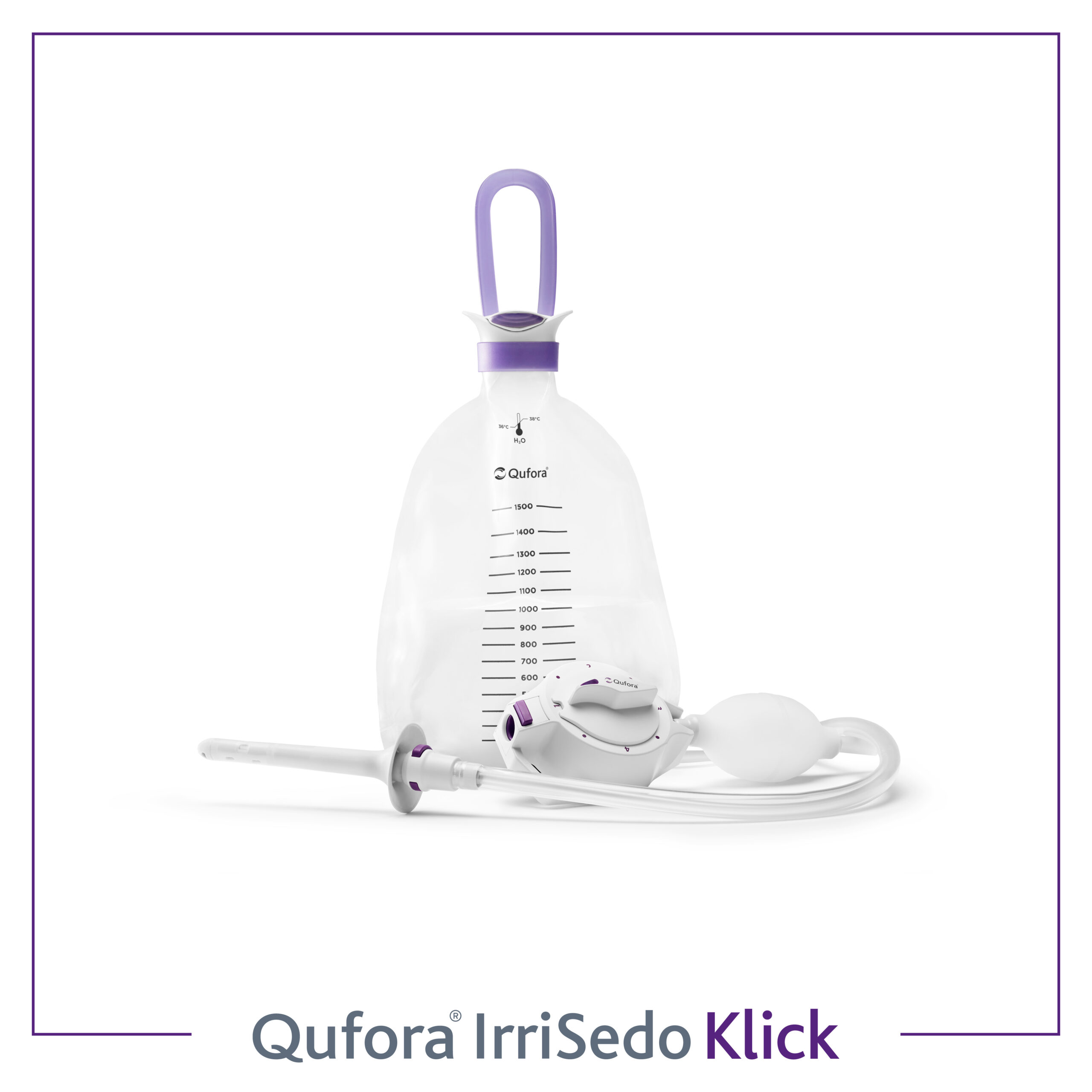 Entdecken Sie Qufora IrriSedo Klick, unsere neueste, einfach zu handhabende Irrigationslösung für Menschen mit Darmfunktionsstörungen, die mit einem Kathetersystem irrigieren.