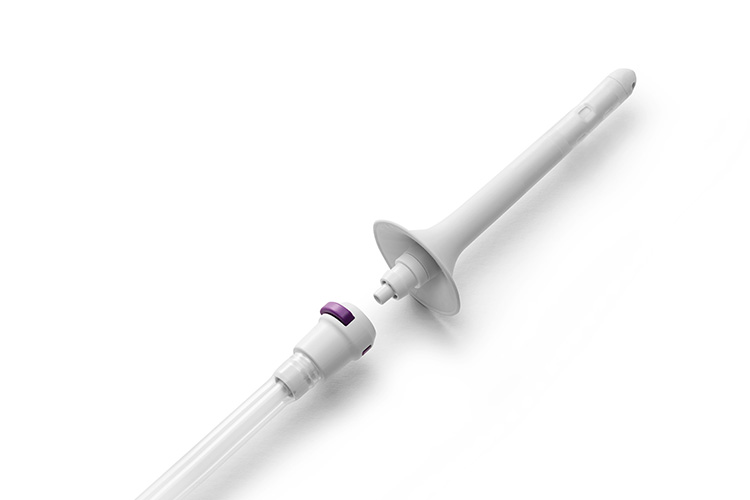 - Eine breite Halteplatte am Katheter sorgt für ein kontrolliertes und bequemes Einführen und Herausziehen