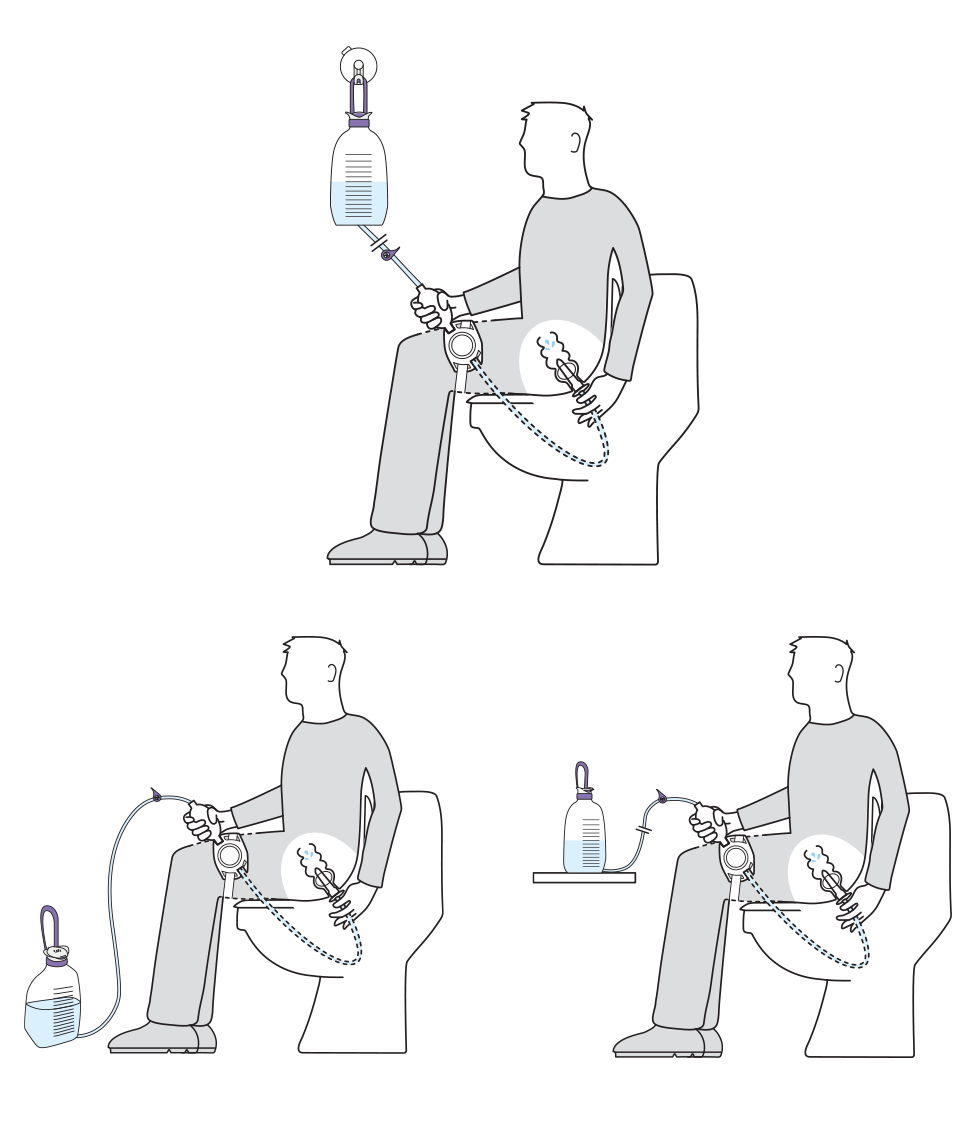 Füllen Sie den Wasserbehälter mit körperwarmem Wasser und platzieren Sie den Wasserbehälter stehend oder hängend zwischen Boden und Schulterhöhe. Verbinden Sie die Anschlüsse mit Handpumpe und Regler und schließen Sie den Katheter an.