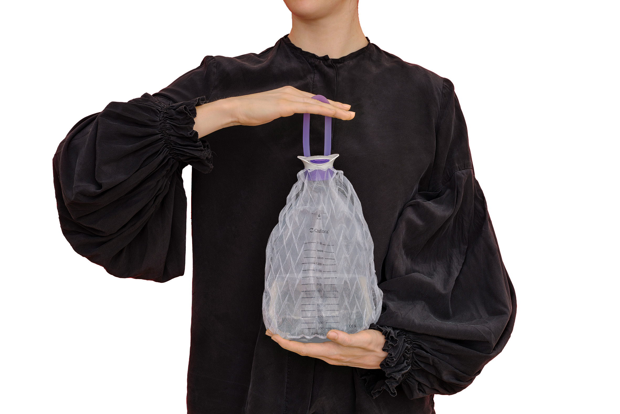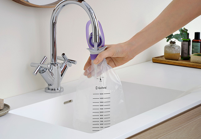 Qufora IrriSedo Klick wurde mit Blick auf die Bedürfnisse von Menschen mit eingeschränkter Handfunktion entwickelt, z. B. ist der breite Hals des Wasserbeutels leicht zu halten. Die Klick-Verbindungen sind beidseitig universell nutzbar, es ist kein Entwirren oder Ausrichten erforderlich.