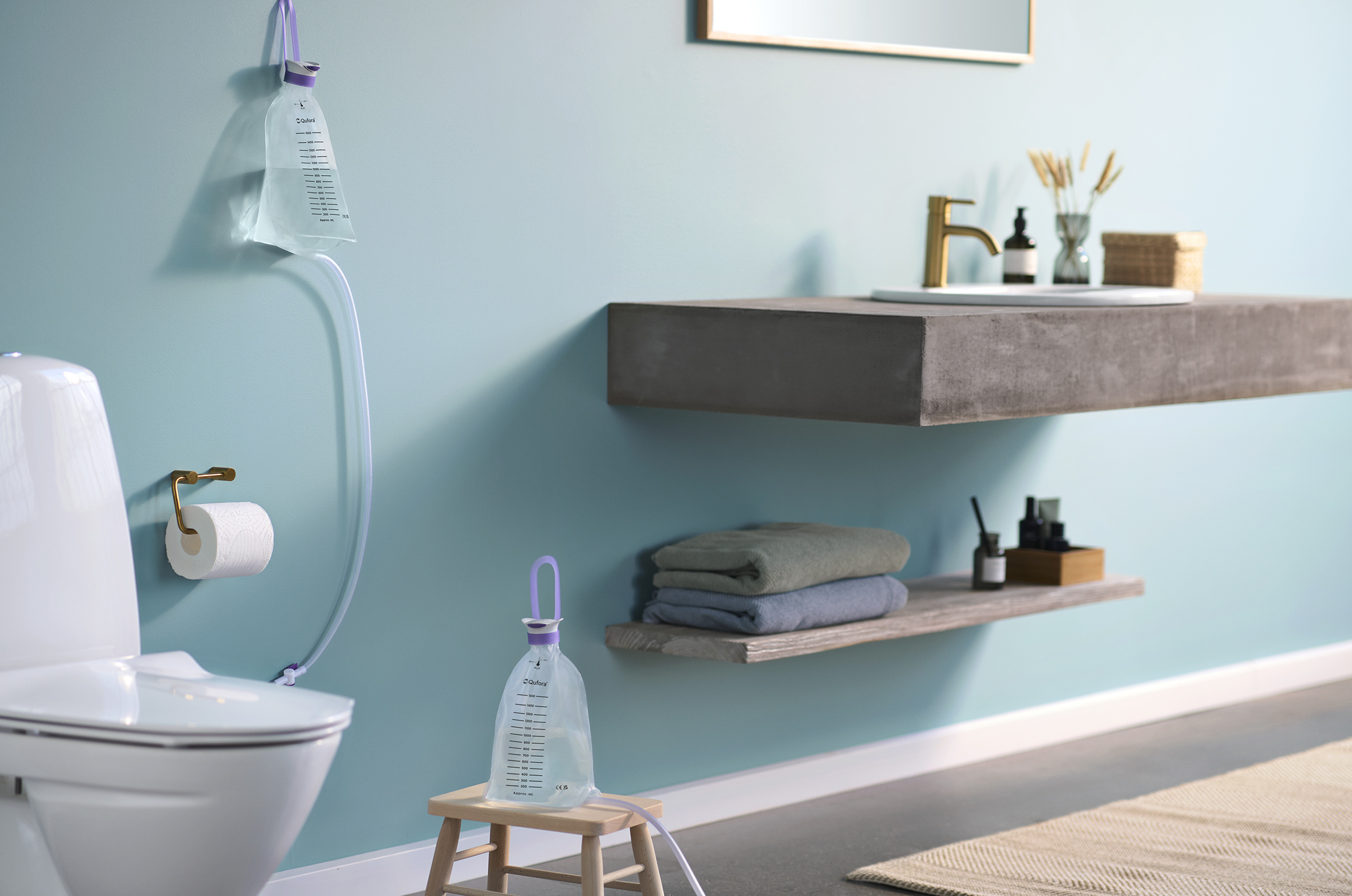 Entdecken Sie Qufora IrriSedo Klick, unsere neueste, einfach zu handhabende Irrigationslösung für Menschen mit Darmfunktionsstörungen, die mit einem Kathetersystem irrigieren.