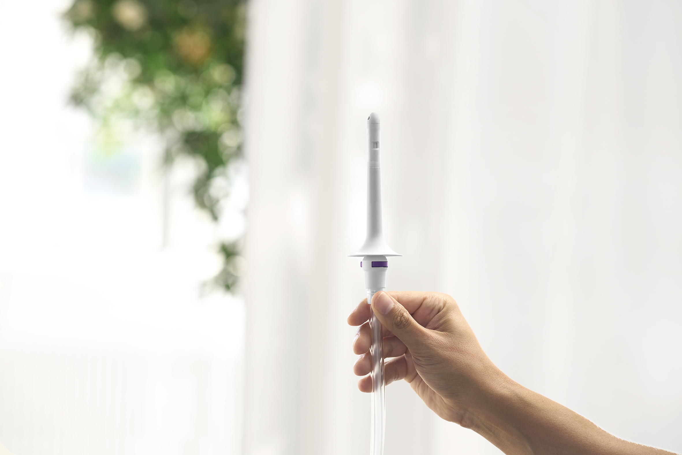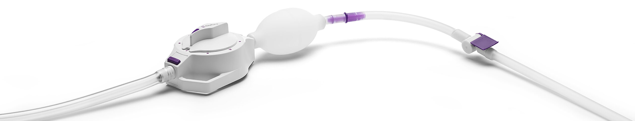 Der Qufora IrriSedo Klick lässt sich unkompliziert und einfach zusammenbauen und ist schnell einsatzbereit. Violettfarbene Bedienelemente zeigen an, wo die Montage erfolgt und am Katheter und an der Steuereinheit stellen die Klick-Verbindungen mit einem hörbaren „Klick“ sicher, dass die Montage korrekt erfolgt ist.